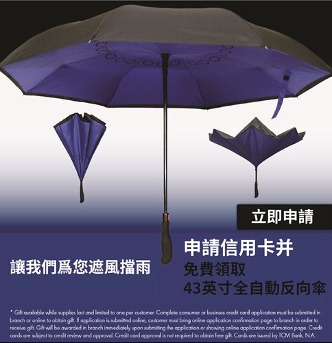優惠大禮,讓我們爲您遮風擋雨!在2022年2月1日至3月31日期間申請國寶銀行信用卡,即可免費獲得43英寸全自動反向傘*。敬請造訪我們的網站:Abacusbank.com,瞭解此活動和信用卡優惠的更多相關資訊。